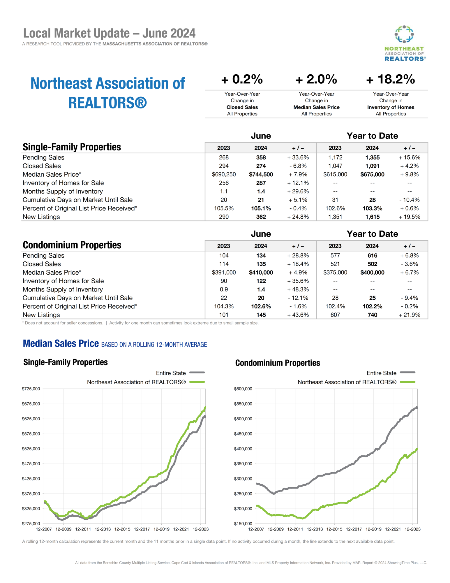 The single-family housing market in the area served by the Northeast Association of REALTORS® (NEAR) posted positive gains in all key indicators including median price, closed sales and inventory through the first six months of 2024, according to the housing market report released today by the association. Compared to the first half of 2023, closed home sales were up more than 4%, median selling price went up nearly 10% and the number of homes listed for sale grew by 12%.
